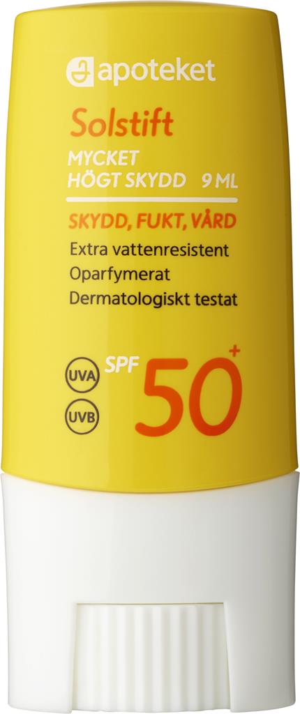 Apoteket Solstift SPF 50+ är ett oparfymerat solstift med mycket högt solskydd som ger skydd mot UVA‑ och UVB‑strålning. Den extra vattenresistenta formulan gör stiftet särskilt lämpligt för mindre och utsatta hudområden som läppar och näsa. Solstiftet innehåller sheasmör och rapsolja som bidrar till att mjukgöra och vårda huden. Formulan innehåller även vitamin E som fungerar som antioxidant som hjälper till att skydda huden och motverka fria radikaler som bildas när huden utsätts för solens UV-strålar. Dermatologiskt testat och anpassat för de flesta hudtyper.
