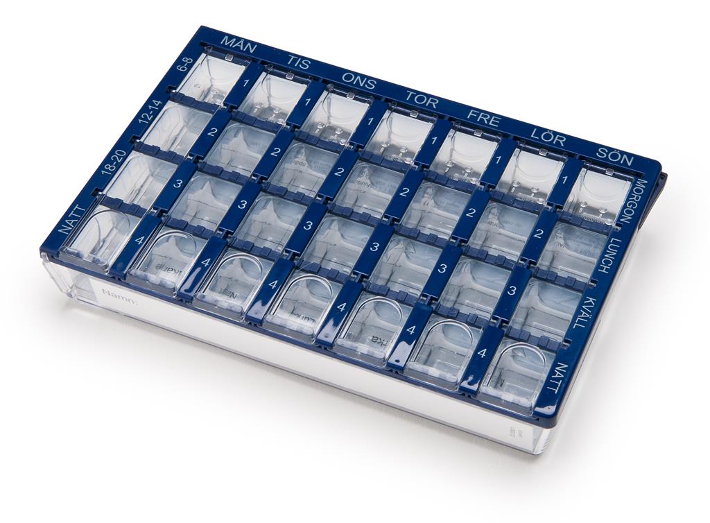 Dosett med 28 fack för medicinering upp till fyra gånger per dygn under en vecka.