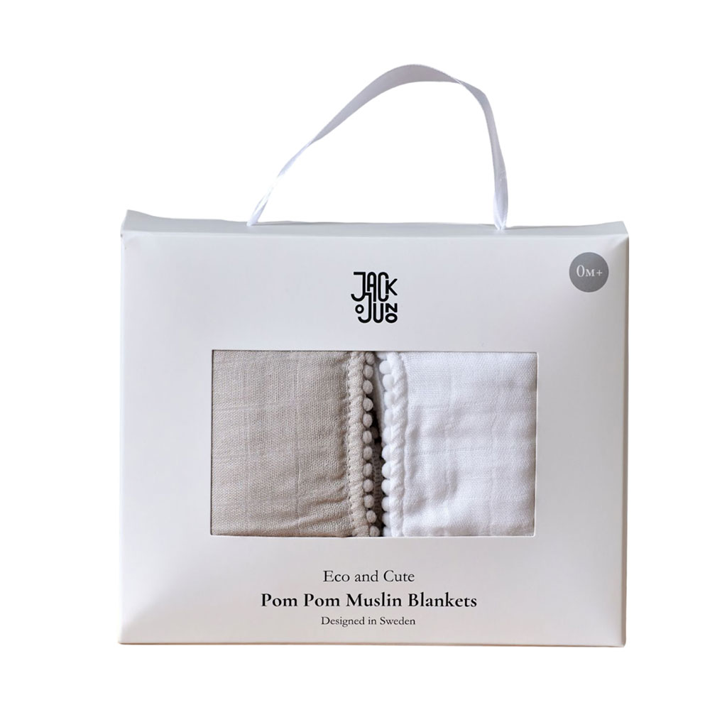 Pom Pom muslinfiltar 2p gjord i bambu och ekologisk bomull. Tvättas i 30 grader, Mått 120*120cm, färg Pearl & Dusty Grey,