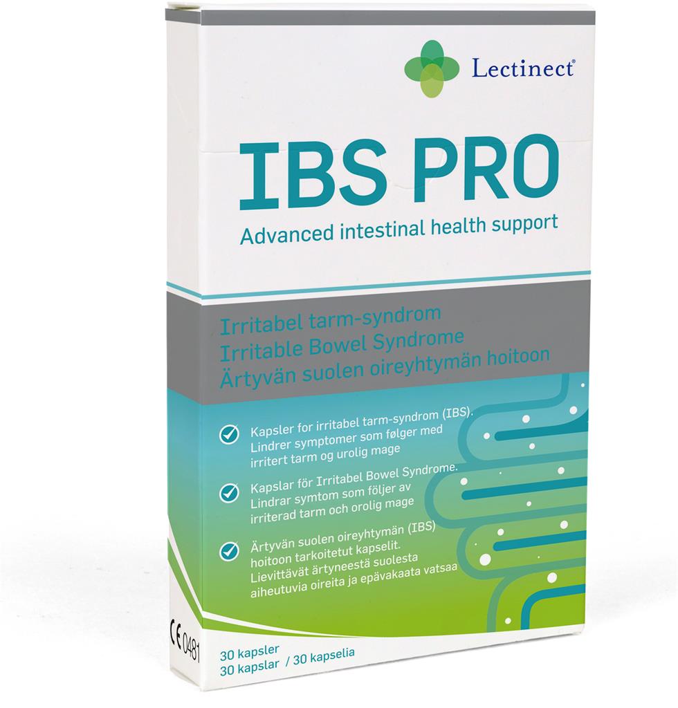 Lectinect IBS Pro är en medicinteknisk produkt som lindrar symptomen på överdriven gasbildning i buken och smärtan som är förknippade med detta hos patienter med irritable bowel syndrome (IBS), inklusive; känsla av uppsvälldhet, spänd mage, mättnadskänsla, rapningar och smärta i samband med gaser i buken. Irritable Bowel Syndrome-kapslar är avsedda att tas oralt. Den rekommenderade dosen för vuxna och barn i åldern 12 år och äldre är 2 kapslar (max) 3 gånger om dagen i 4 veckor. IBS ska tas i samband med eller efter en måltid. Kapseln ska sväljas hel till ett stort glas vätska (200 ml). Behandlingens varaktighet: Använd inte IBS-kapslar längre än 30 dagar under en enskild behandlingsperiod. Förvaring: torrt i normal rumstemperatur och oåtkomligt för små barn OK för gravida och ammande: Nej Ingredienser:Ingredienser: Bentonit, Simetikon 50 %, Hypromellos, Mikrokristallin cellulosa, Magnesiumstearat, Oleum helianthus.