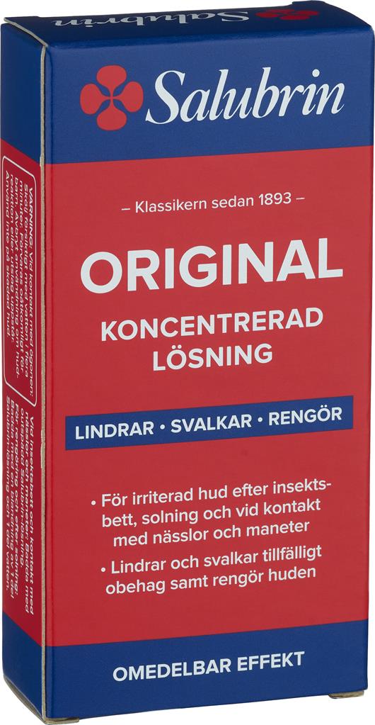 Salubrin Koncentrerad Lösning används mot klåda av nässlor, insektsstick, maneter och vid lindrig solsveda. Rengörande medel vid finnar och för att motverka dålig lukt på fötterna.