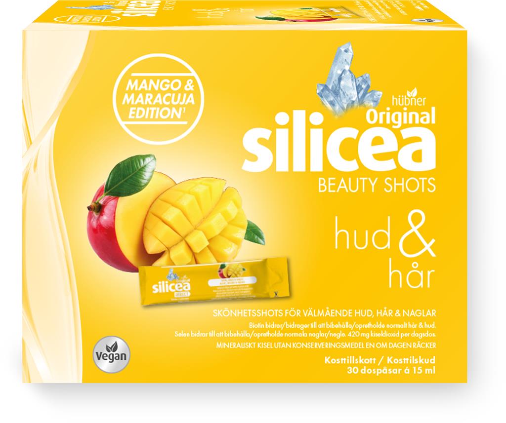 Silicea Skönhetsshots Hår & Hud är ett kosttillskott i portionspåsar med tropisk smak av mango och maracuja. Varje shot innehåller finfördelad kiseldioxid (kisel) samt biotin och selen. Biotin bidrar till att bibehålla normalt hår och normal hud, och selen bidrar till att bibehålla normala naglar. Den flytande formen kan tas direkt i munnen eller blandas i vatten, juice eller smoothie.